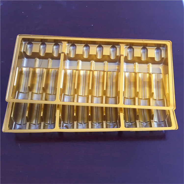 在選用吸朔加工工藝將全透明的塑膠片材制成特殊的突起形的全透明塑膠罩于F品表層,具有維護(hù)及其清理商品的功效,將一般的塑膠硬,在表層上沾到一層溶質(zhì)的原材料,進(jìn)而使拖盤表層有一種溶質(zhì)的觸感以用于提升包裝用品的級別,選用獨(dú)特I藝改性工程塑料的吸塑托盤該原材料表層的電阻器值低于10的11次放歐母.適用于電子器件.I商品的靜電感應(yīng)拖盤。